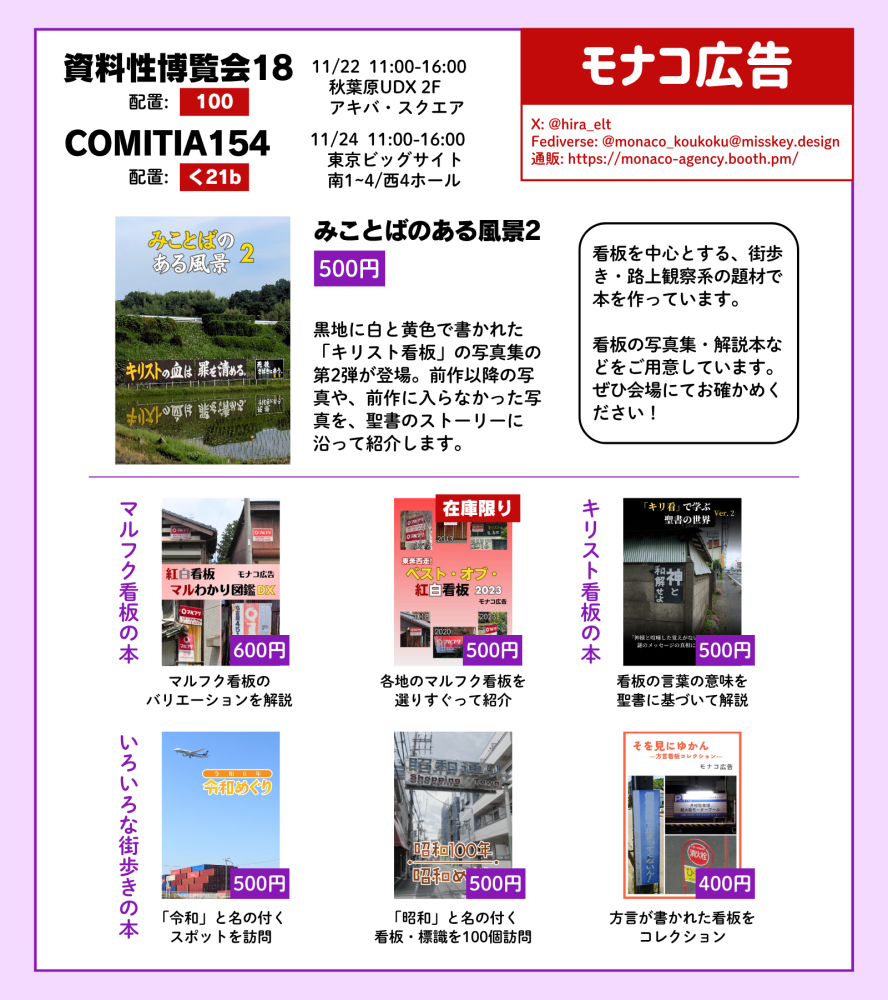 10月発行の『みことばのある風景2』をはじめ、キリスト看板やマルフク看板など様々な看板をテーマにした本をご用意しています。
