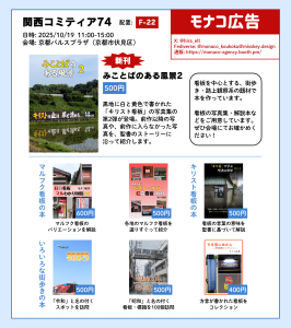 イベント情報: 関西コミティア74 日程 2025/10/19 会場 京都パルスプラザ 大展示場 当サークルの配置 F-22 入場料 1000円(カタログ代) イベント公式サイト https://www.k-comitia.com/ 関西コミティアには初のサークル参加となります。 新刊『みことばのある風景2』を携えて参加いたします。 お品書き 配置図