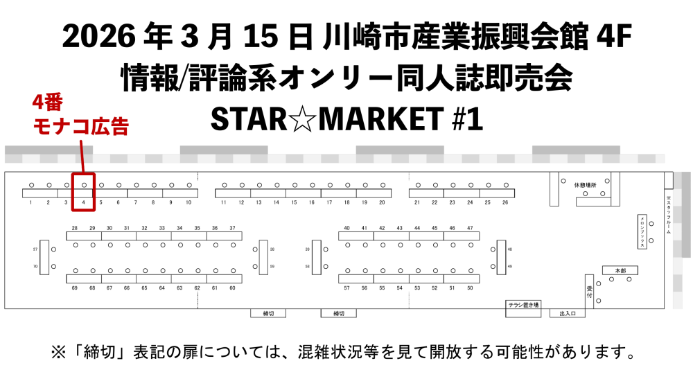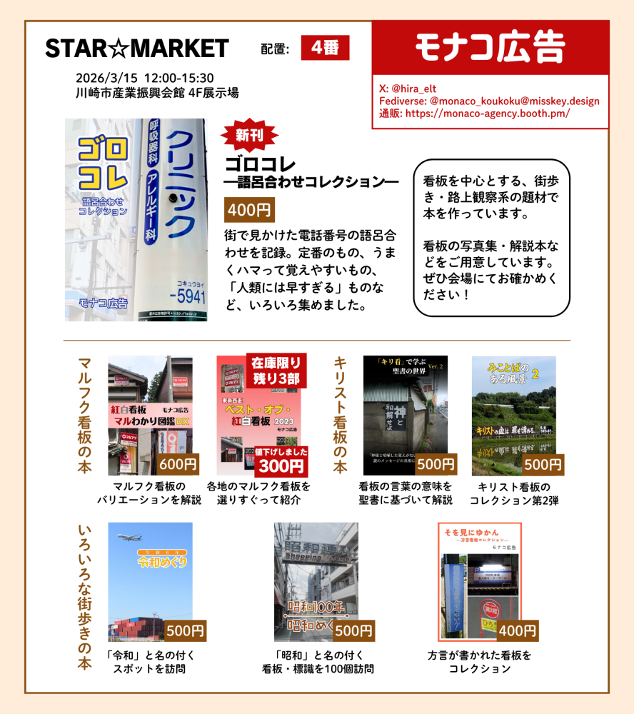 イベント情報: STAR☆MARKET 日程 2026/03/15 会場 川崎市産業振興会館 4F展示場 当サークルの配置 4番 入場料 無料 イベント公式サイト https://starmarketdoujin.wixsite.com/stmkt 3月新刊『ゴロコレ』このイベントにももちろん持参します。 『東奔西走!ベスト・オブ・紅白看板2023』は残り3部、300円で頒布します。 お品書き 配置図
