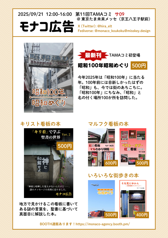 イベント情報: 第11回TAMAコミ 日程 2025/09/21 会場 東京たま未来メッセ(八王子) 当サークルの配置 サ09 入場料 無料(パンフレットは任意購入) イベント公式サイト https://tamacomi.info/11/ 今回は6作品を携えて、1年ぶりの八王子に降り立ちます。 お近くの皆様、ぜひよろしくお願いいたします! お品書き 配置図